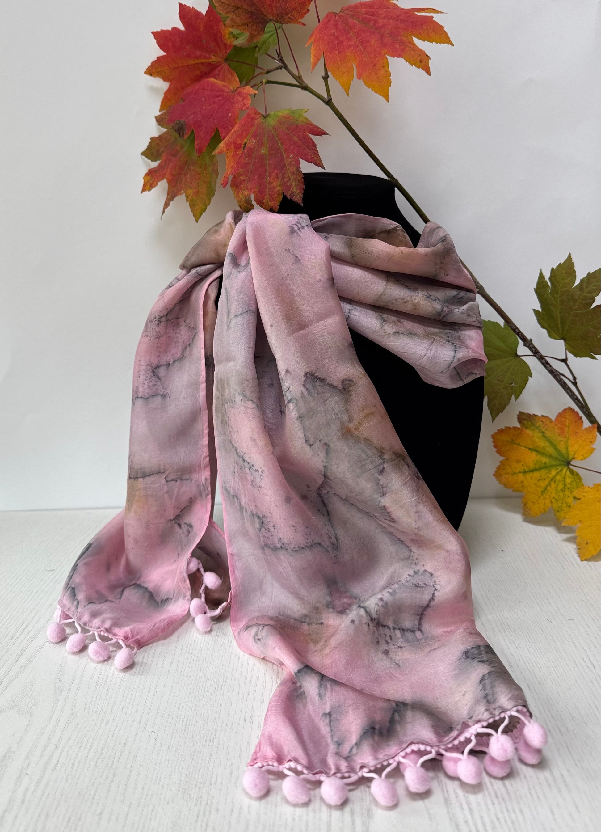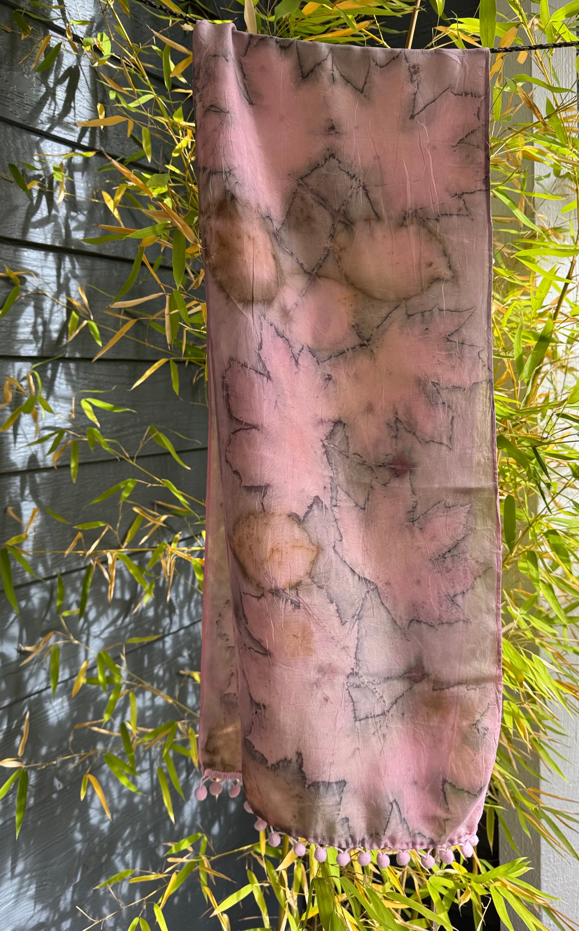 Adorn yourself with this luxurious eco-printed silk scarf that captures the beauty and essence of Autumn. A one-of-a-kind creation with nature’s rich bounty.