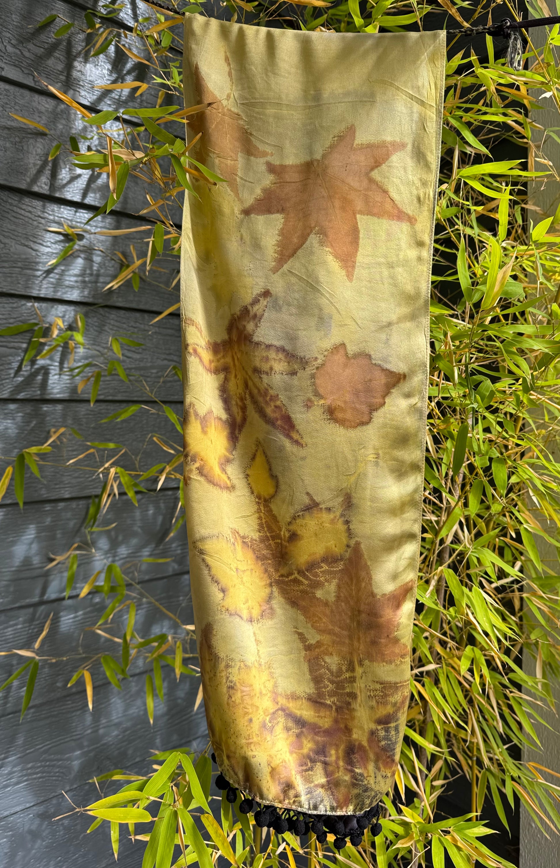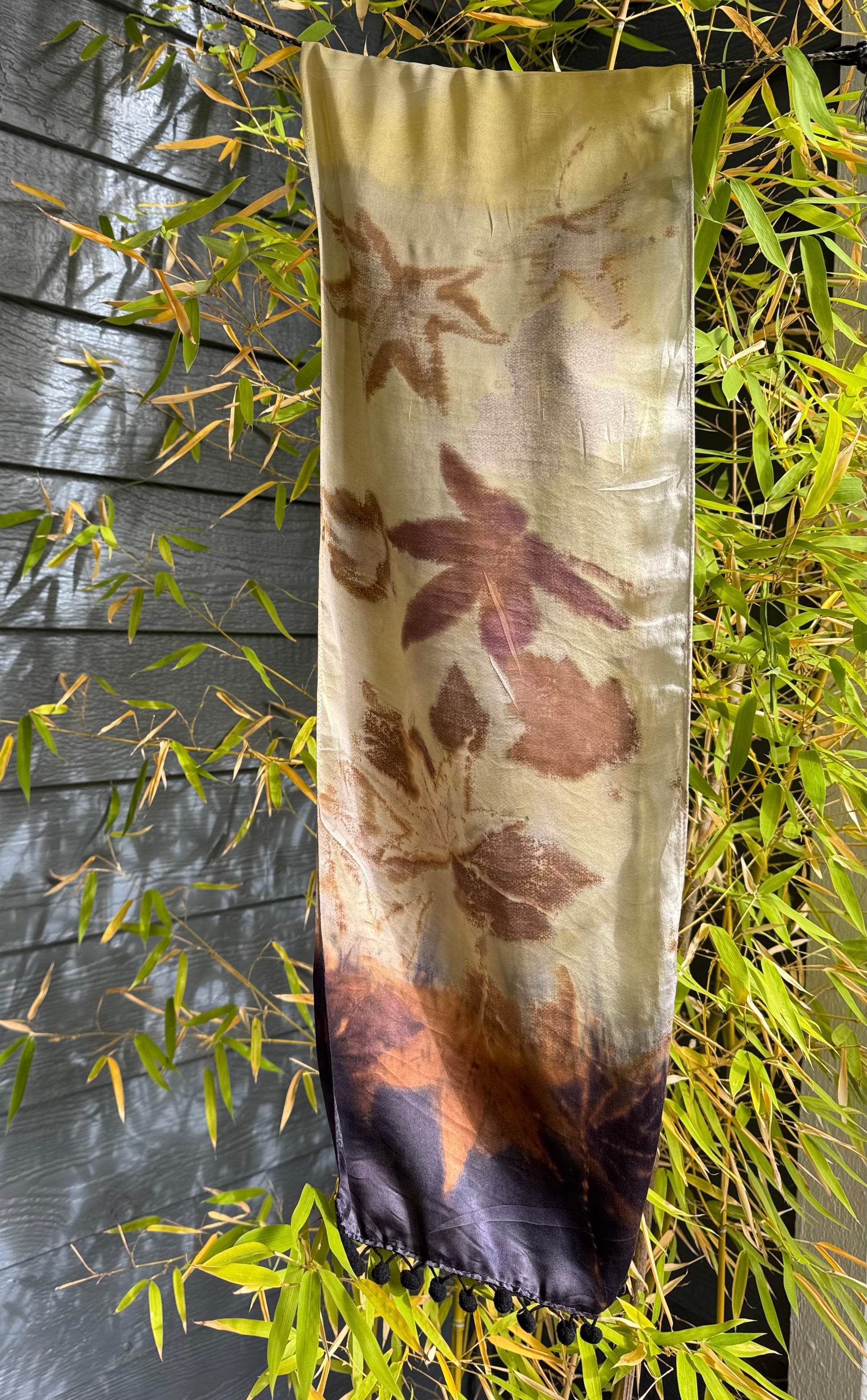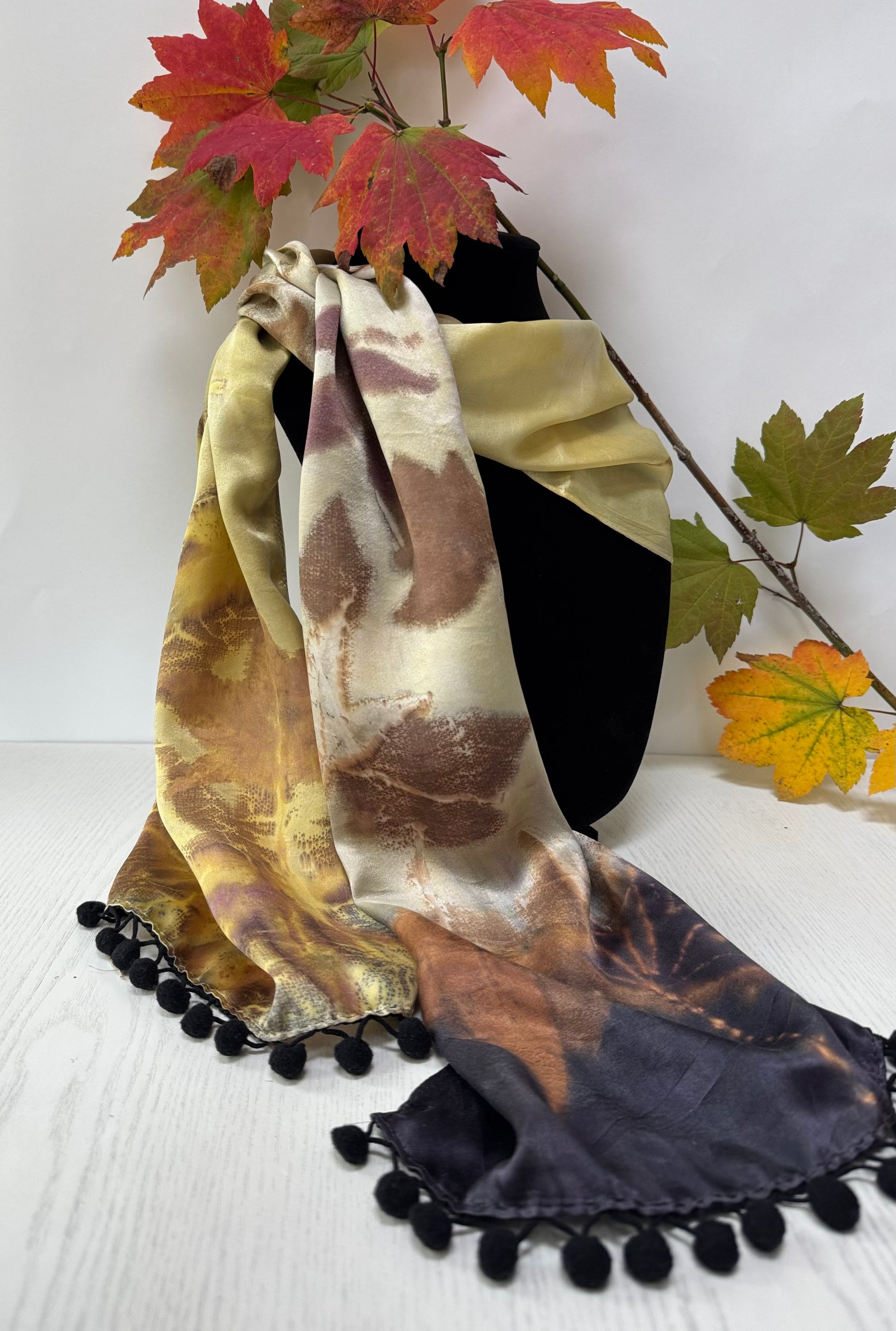 Adorn yourself with this luxurious eco-printed silk scarf that captures the beauty and essence of Autumn. A one-of-a-kind scarf creation with nature’s rich bounty.