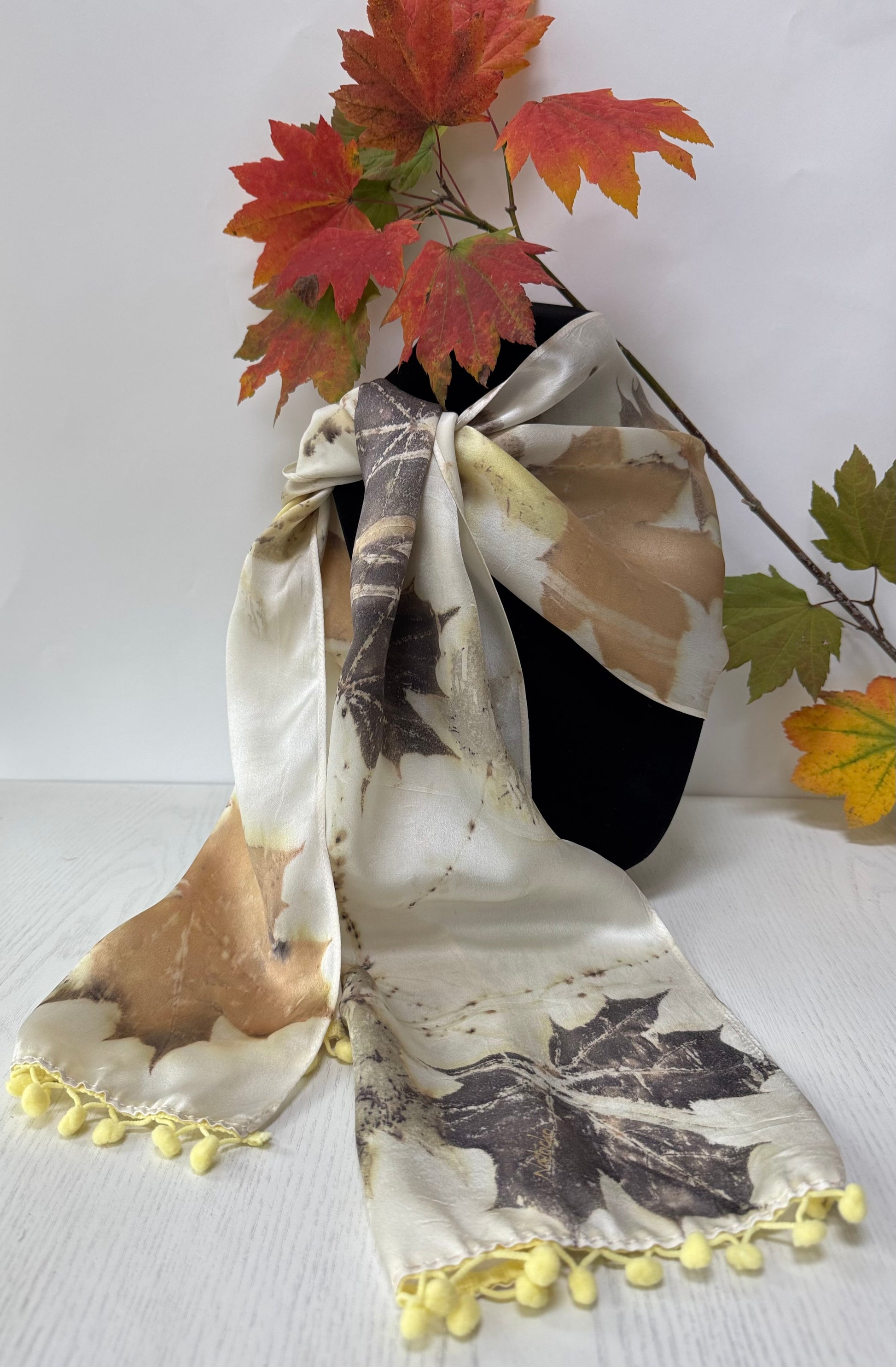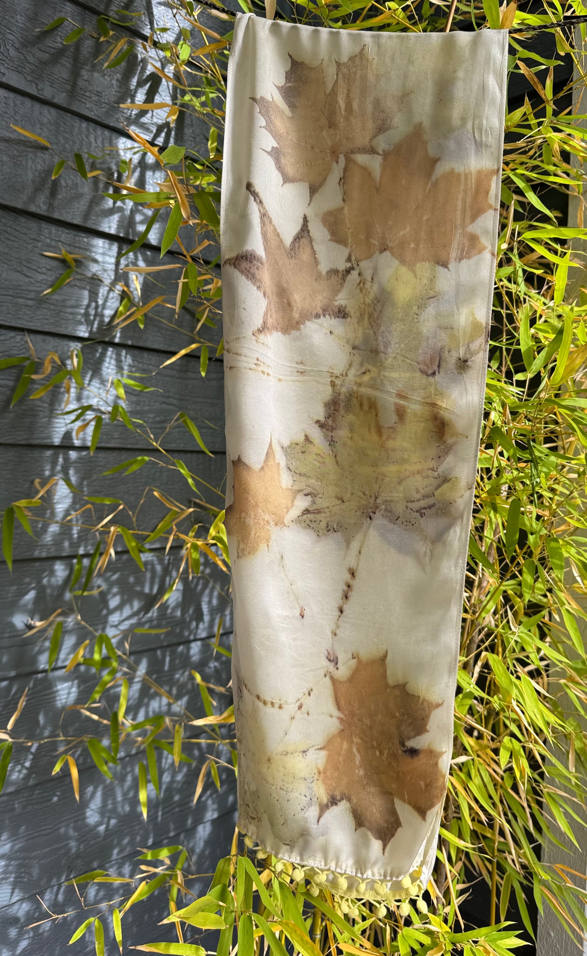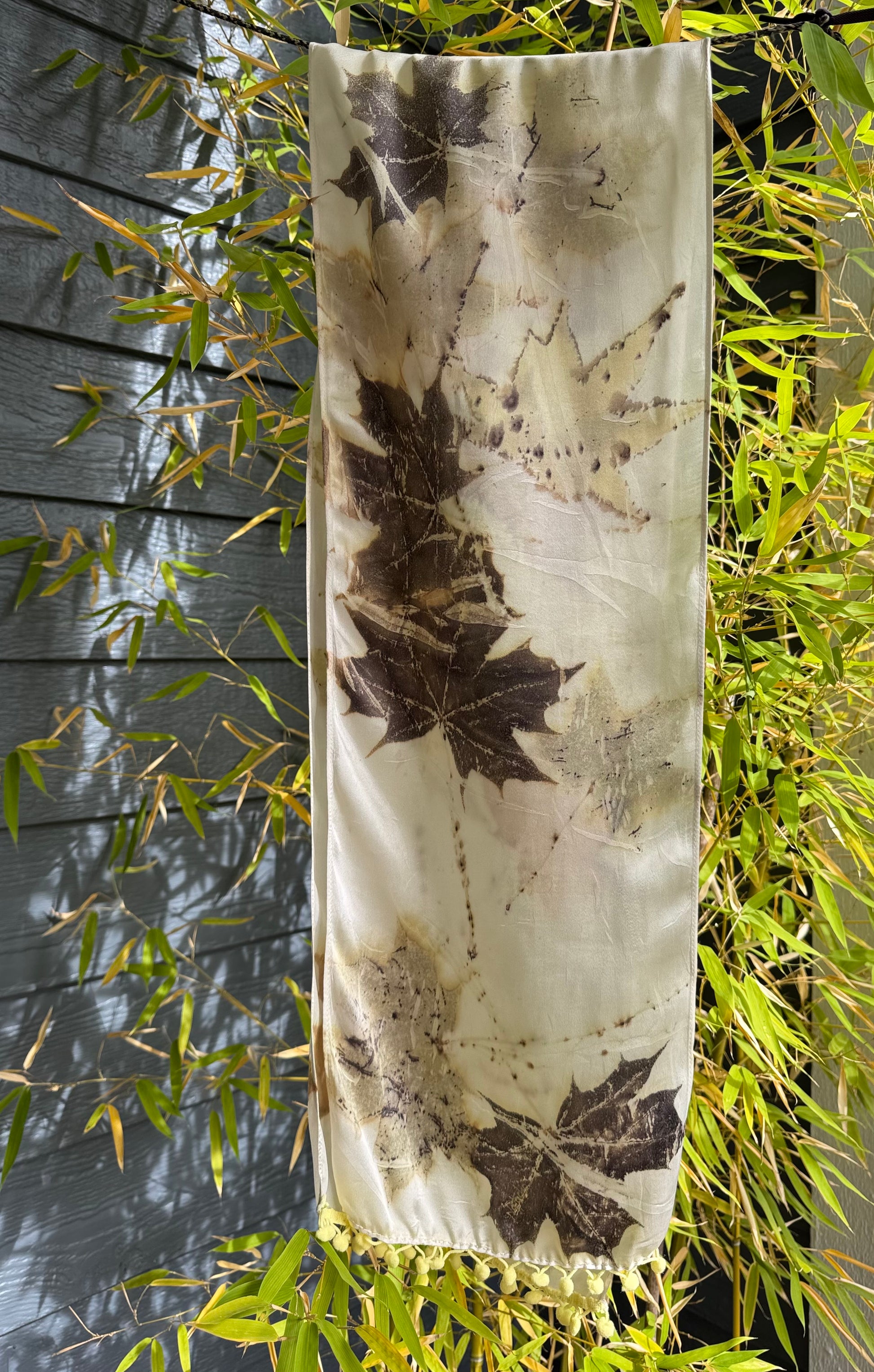 Adorn yourself with this luxurious eco-printed silk scarf that captures the beauty and essence of Autumn. A one-of-a-kind creation with nature’s rich bounty.